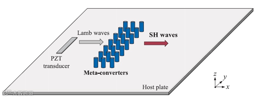 横向剪切波(SH波)具有平面内且垂直于传播方向的振动特征,因其无色散、对裂纹模式转换敏感度低及信号简洁等优势,被广泛应用于薄壁结构的健康监测(SHM)。然而,高效激发SH波仍具挑战。目前主要方法包括电磁声换能器(EMAT)与剪切型压电换能器(PZT)。EMAT虽为非接触式,但体积大、安装复杂;PZT换能器结构紧凑,却产生的SH波强度较弱,限制了其应用。相比之下,兰姆波易于由常规PZT产生,因此通过将兰姆波模式转换为SH波成为一种潜在方案。近年来,超材料因具备可设计的波传播特性,在波过滤、导向及模式转换等领域展现出巨大潜力。部分研究已利用超材料实现纵波向SH波的模式转换,但仍存在转化效率低、结构复杂和频带窄等问题。为此,需发展基于三维结构设计与拓扑优化的超构转换器,实现兰姆波向SH波的高效能量转换,为SHM提供新型、稳定且可表面安装的激励方案。