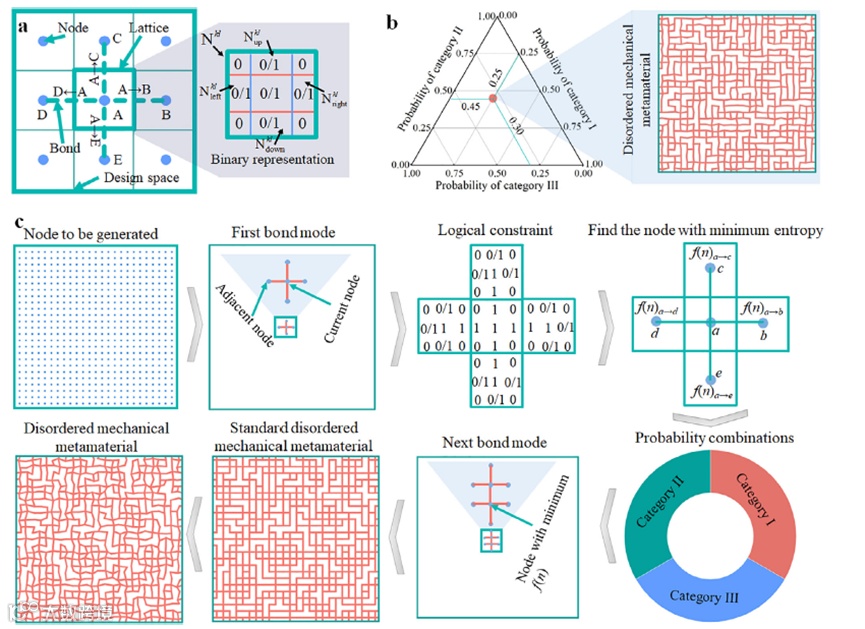机械超材料突破了传统材料的物理极限,展现出诸如负泊松比、负有效模量、负可压缩性及高韧性等优异性能。作为其重要分支,无序机械超材料因轻质高强和可调力学特性而备受关注。其内部键的随机分布虽有助于能量集中、应力缓解与形变重构,却不可避免地产生局部易断裂区域,使材料在受载时易发生突发破坏,显著降低结构可靠性。以往研究主要依赖拓扑优化、刚度调控及无序度调节等方法改善其断裂行为,但由于无序结构的随机性,这些方法在同时兼顾结构异质性与断裂区域控制方面存在困难。基于摩擦填料或Voronoi结构的研究揭示了无序与刚度在脆–韧转变中的关键作用。按照Griffith理论,脆性材料的应力集中于局部易形成裂纹,而增大无序度或刚度可使应力更均匀分散。然而,无序度或刚度的局部调节过程复杂,且增加无序度会削弱强度,提高刚度又损害轻量特性。为克服局部调控与性能平衡难题,研究逐渐转向“易断裂区域预测”与“定向强化”两方向,但仍面临非均匀键长下预测精度不足及单参数强化破坏性能平衡等核心挑战。