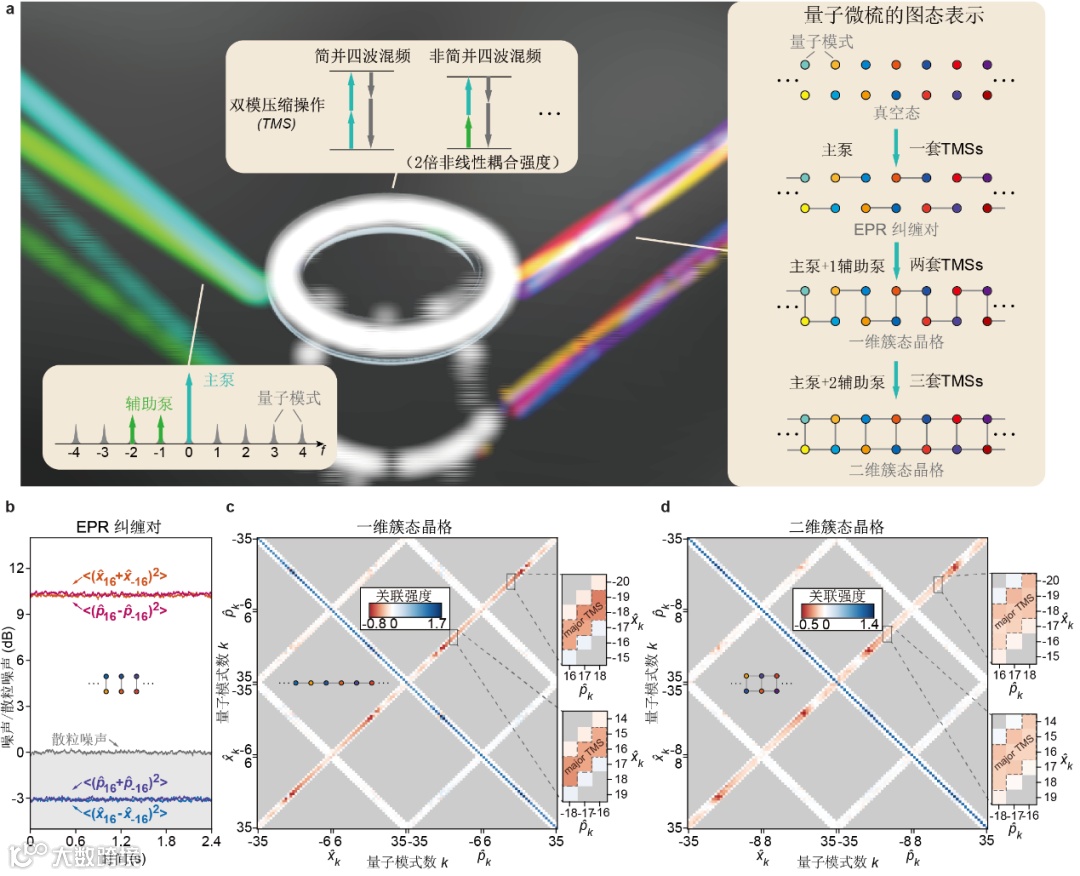 图1:(a)构造簇态量子微梳的基本原理。(b)EPR对正交分量的噪声。灰线:散粒噪声。(c)一维簇态的协方差矩阵。(d)二维簇态的协方差矩阵。