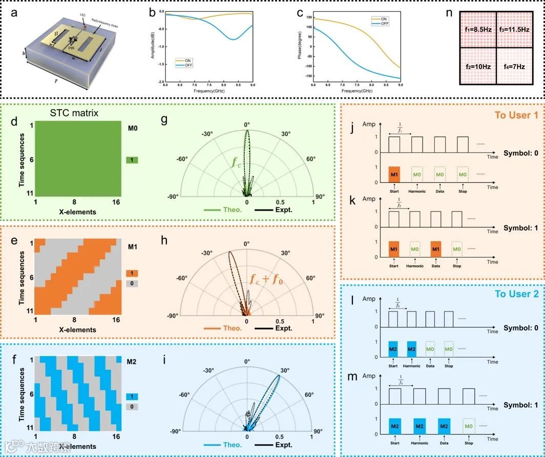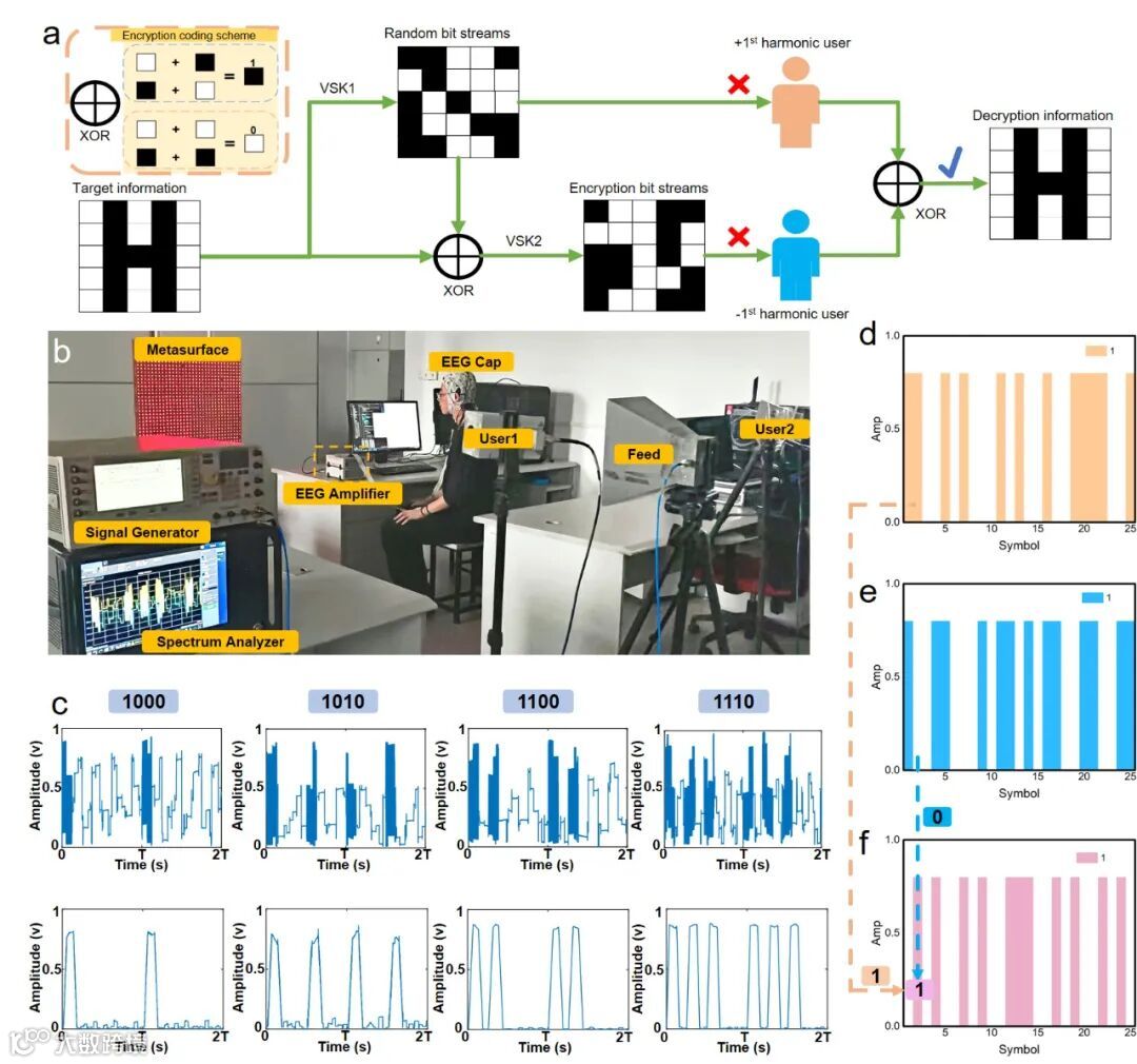 为了验证提出的脑机时空超表面平台性能,我们展示了一个结合物理层安全和密码学加密方法的安全加密无线通信系统,如图3所示。在所提出的安全加密无线通信系统中,首先将传输的信息随机加密为两个密文。然后,BCI操作人员自由凝视四个BSTCM区域的视觉刺激,构建两个不同谐波频率相关的物理信道(+1阶和-1阶谐波),分别将两个密文的比特流数据发送给两个指定的谐波用户。因此,不同的脑电图信号被生成并分类为四个命令,然后被发送到FPGA以产生相应的四个BSTCM信号,如图2j–m所示。在解密过程中,需要在指定的谐波通信信道收集两个不同的密文,通过异或操作可恢复原始信息,提出的BSTCM系统展现了强大的信息安全级别。未来,加密方案可以扩展到包括更多用户,进一步增强BSTCM系统的安全性。