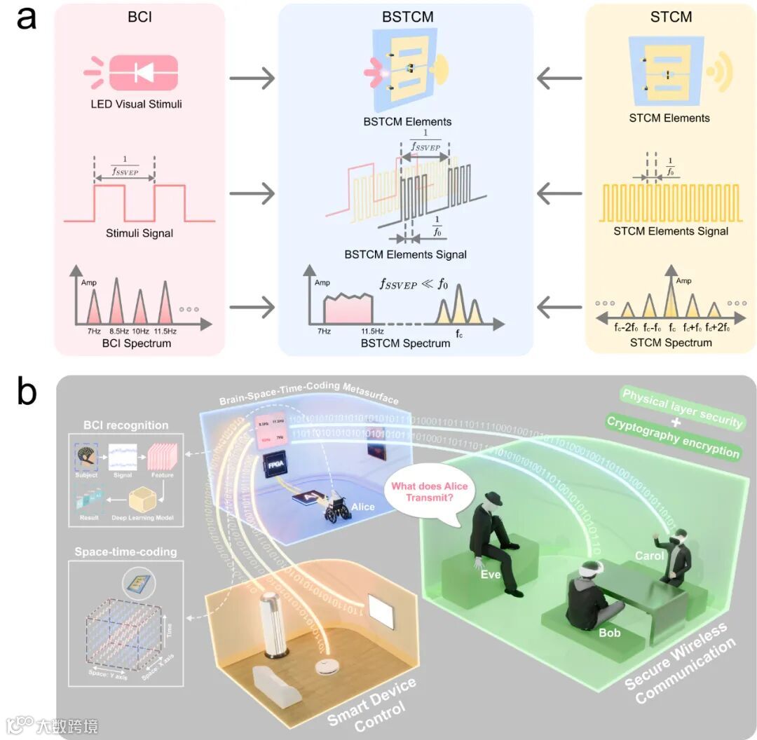近年来,脑机接口(Brain-computer interface,BCI)在人脑和外部设备之间提供了一条相互连接的交互通路,已成为人机交互领域的前沿技术,并展示了非常具有前景的应用。非侵入式的脑电图信号仍然是BCI系统中的主要输入信号形式,主要包括运动想像、P300和稳态视觉诱发电位(SSVEP)。基于SSVEP的BCI系统利用大脑对固定频率视觉刺激的SSVEP反应进行思维识别和交互,提供了高信息传输速率的显著优势。6G无线通信技术的进步极大地扩展了BCI的潜在应用。因此,在促进所构建的通信环境中的智能交互时,确保BCI用户和设备的高度信息安全和隐私保护变得至关重要。此外,视觉刺激往往与后端信息处理相隔离,缺乏深度集成和交互。随着对安全BCI系统需求的增加,在安全可靠的无线通信环境中实现智能交互至关重要。时空编码超表面的可编程谐波特性与SSVEP脑电信号的频率响应具有显著的相似性。因此,时空编码表面作为一种具有巨大潜力的方法,它不仅提供视觉刺激,而且由于其在时间和空间范围内灵活操纵电磁波的强大能力,在物理层可增强BCI系统的安全性。在此背景下,研究团队深度融合BCI视觉刺激编码与超表面时空编码,提出了一种脑机时空超表面平台,实现了安全的无线通信传输和意念远程控制智能设备,为人机交互提出了一种新的工作范式。