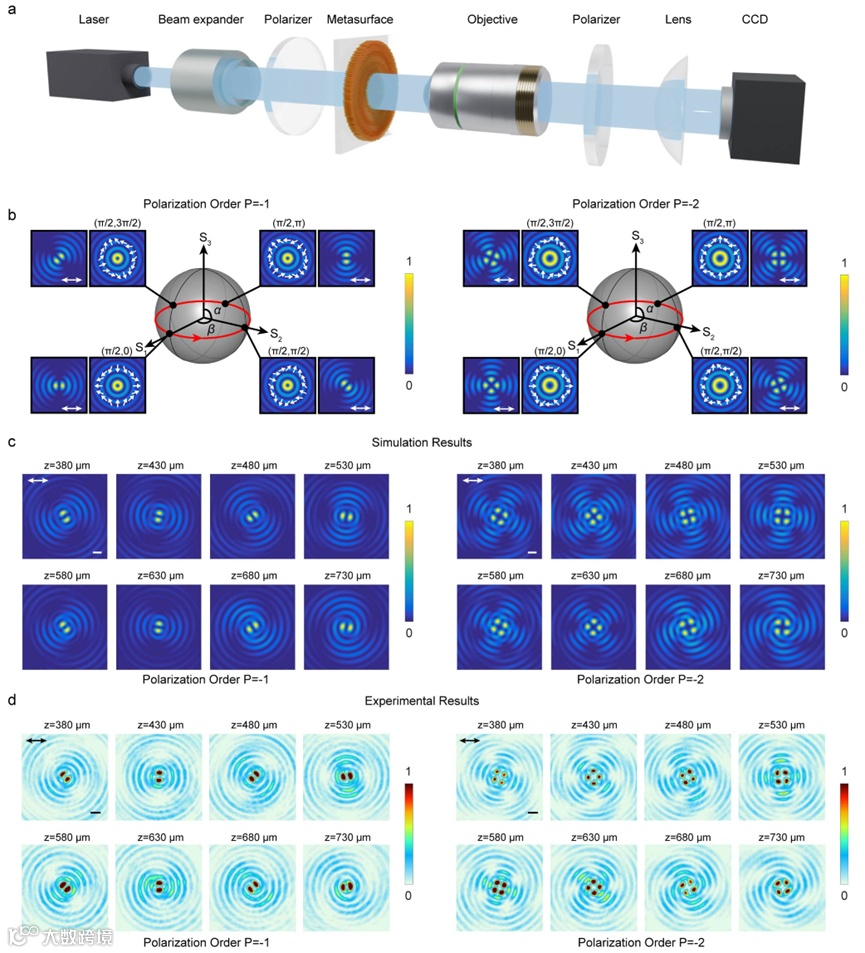 通过数值仿真和实验测量,验证了该设计方案的可行性,如图3所示。研究团队进一步展示了沿传播轴具有偏振演变的双矢量光场生成。该方法为光-物质相互作用、复杂结构光生成及量子纠缠等应用开辟了新途径。