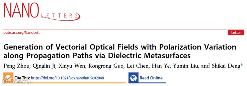 近日,中科院上海微系统与信息技术研究所邓诗凯研究员团队与北京邮电大学刘玉敏教授团队合作,首次将“传播距离关联相位差”机制与自旋复用超表面深度融合,通过精确调控相位差,实现了沿传播路径动态演化的矢量光场生成,突破了光场调控中长期存在的动态生成瓶颈。该研究从理论框架、数值模拟到实验验证,系统地揭示了自旋态与空间相位演化之间的耦合关系,为新型矢量光场调控提供了通用平台。相关成果以“Generation of Vectorial Optical Fields with Polarization Variation along Propagation Paths via Dielectric Metasurfaces”为题,于2025年6月4日在国际顶级期刊Nano Letters在线发表。北京邮电大学博士研究生周鹏为论文第一作者,中科院上海微系统与信息技术研究所邓诗凯研究员为论文通讯作者。北京邮电大学陈蕾讲师对本研究做出重要贡献,其他主要合作者还包括中科院上海微系统与信息技术研究所助理研究员冀清霖、博士研究生温欣宇等。北京邮电大学刘玉敏教授、叶寒教授亦对研究有悉心指导。
