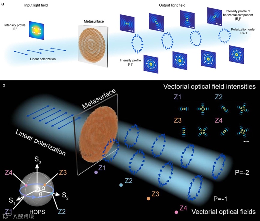 针对这一挑战,中科院上海微系统所邓诗凯研究员与北京邮电大学刘玉敏教授,叶寒教授合作,在超表面关联传播距离与相位差Δφ,通过传播相位与几何相位协同调控正交圆偏振分量,实现偏振态沿传播路径的连续演化。其概念如图1所示,当线偏振光照射超表面,生成携带相反轨道角动量的涡旋光场,并通过线性叠加得到携带偏振奇点的矢量光场。