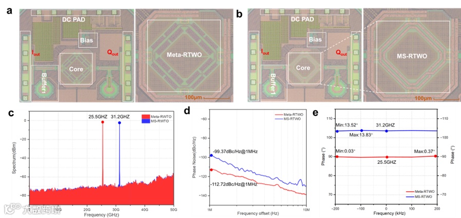 图3. 实验验证。(a) Meta-RTWO 芯片的显微照片。(b) MS-RTWO 芯片的显微照片。(c) Meta-RTWO 和MS-RTWO 的频谱测量结果。(d) Meta-RTWO 和MS-RTWO 的相位噪声测量结果。(e) Meta-RTWO 和 MS-RTWO 的正交信号相位误差测量结果。