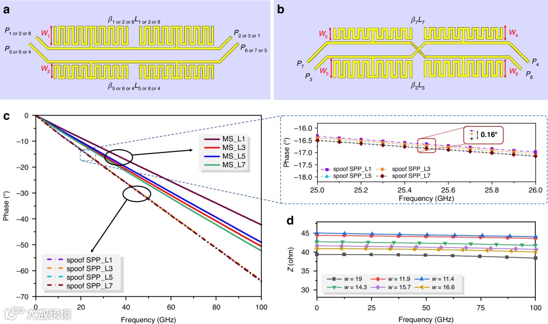 图2. Meta-RTWO 谐振器的设计。(a) 非交叉的spoof SPP TL 结构。(b) 交叉跳线的spoof SPP TL 结构。(c) Meta-RTWO 和MS-RTWO 谐振器不同段传输线的相移曲线。(d) 组成 Meta-RTWO 谐振器的不同spoof SPP 单元的特性阻抗提取。