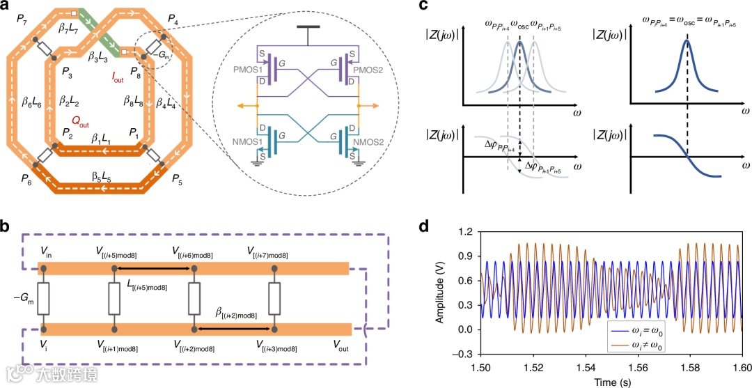 图1. Meta-RTWO 的理论分析。(a) Meta-RTWO 结构:莫比乌斯环谐振腔和和均匀分布的 -Gm 单元结构。(b) Meta-RTWO 开环结构。(c) 谐振器的振幅与相位响应曲线。(d) Meta-RTWO 在 ωi=ω0=4.7e11rad/s 和ωi+4-ωi=1.7e11rad/s 两种情况下的时域仿真波形。