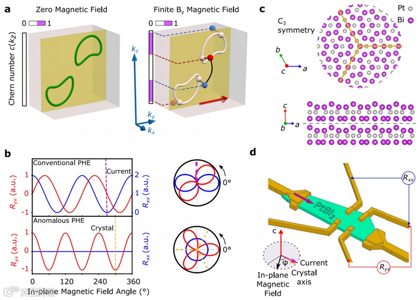 近日,德国莱布尼茨固体与材料研究所的Arthur Veyrat、Joseph Dufouleur和意大利萨莱诺大学的Carmine Ortix副教授研究团队,报道了在三角晶系材料PtBi2中发现的一种由拓扑节线引发的独特电荷输运效应:在共面电场与磁场作用下出现的无耗散横向电信号,即反常平面霍尔效应(APHE)。该效应源于拓扑节线在任意弱磁场下的非局域拓扑相变,理论模型表明,这种转化在kz方向产生大范围非零陈数区域,从而在弱磁场下诱导出显著的反常霍尔电导,其方向位于共面电磁场平面内,且不伴随任何耗散的纵向电阻变化。实验上,在PtBi2纳米结构中观测到清晰的2π/3周期性APHE振荡信号,该信号具有反对称磁场依赖性,且在高达室温下保持稳定,与材料中存在的多重镜面保护拓扑节线一致。理论计算证实,PtBi2费米能附近存在多重节线环,弱磁场下这些节线转化为六重简并的外尔点群,其贡献远超材料固有外尔点的微小位移效应,主导了观测到的APHE信号。该效应不仅是拓扑节线的直接电磁响应指纹,更提供了一种通过任意弱磁场“剪裁”节线以工程化外尔节点的普适途径,并为在更广泛的三角晶系半金属中无损探测拓扑节线提供了强有力的磁输运工具。其室温鲁棒性及无耗散特性,为未来开发基于拓扑节线的低能耗电子器件奠定了基础。该研究成果发表于《Nature Communications》。(刘梦洋)