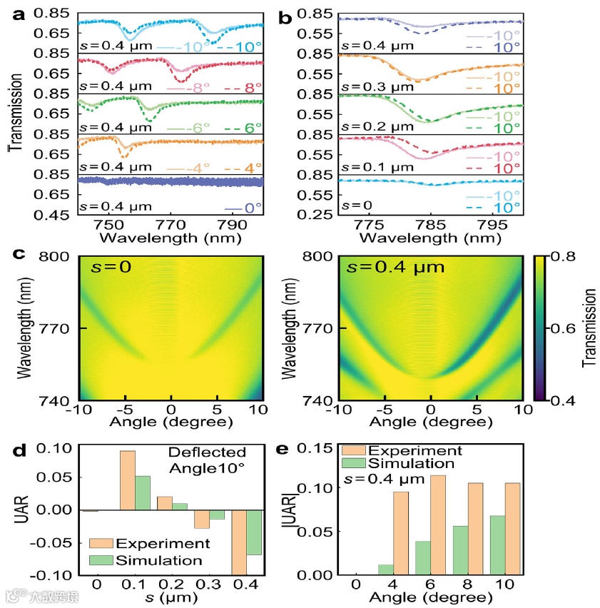 实现的效果:实验制备了层间位移的双层超表面,观测到同侧非对称传输,最大传输差异可达 0.1,验证了 q-BIC 的远场偏振态不对称性,为设计片上激光器、高效耦合器等纳米光学器件提供了新路径。