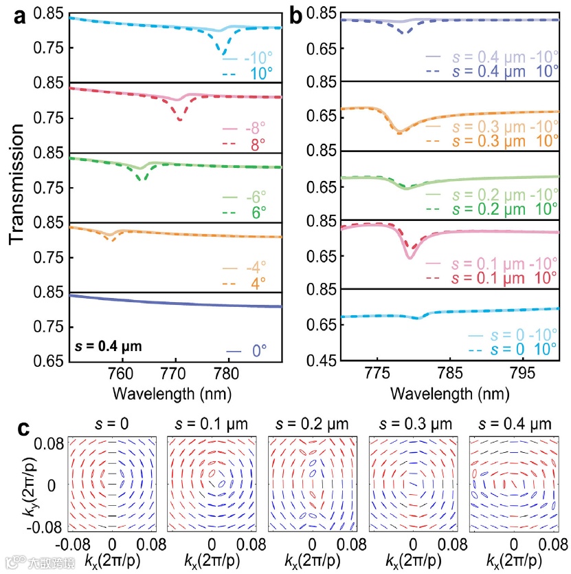 图3:不同偏移双层超表面的模拟光谱和远场偏振分布。