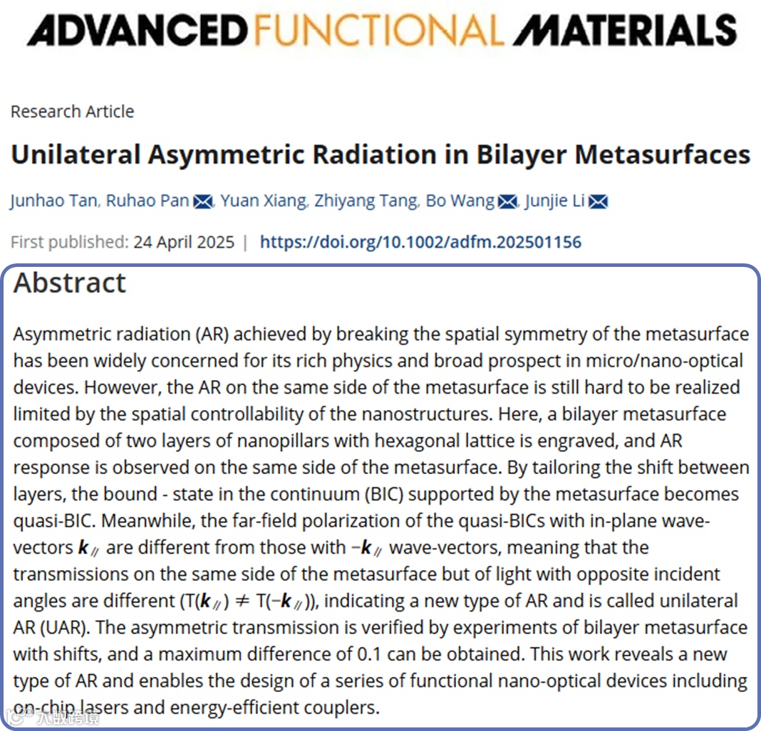 J. Tan, R. Pan, Y. Xiang, Z. Tang, B. Wang, J. Li, Unilateral Asymmetric Radiation in Bilayer Metasurfaces. Adv. Funct. Mater. 2025, 2501156.