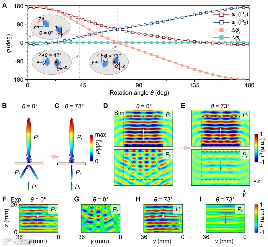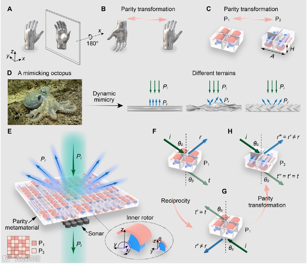 提出的方法:提出宇称超材料设计框架,通过宇称变换构建任意三维超原子及其宇称反转对应体,组成超材料平板。利用互易性与宇称变换的协同作用,保证宽频带无失真传输,同时通过旋转超原子动态调控反射特征,实现声学伪装。