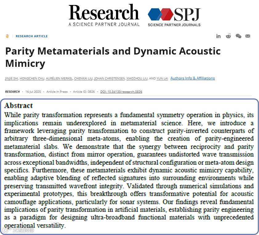 研究成果以《Parity Metamaterials and Dynamic Acoustic Mimicry》为题发表于《Research》。南京大学Jinjie Shi、南京师范大学Hongchen Chu为论文共同第一作者,南京大学Xiaozhou Liu、Yun Lai和IMDEA材料研究所Johan Christensen为论文共同通讯作者。