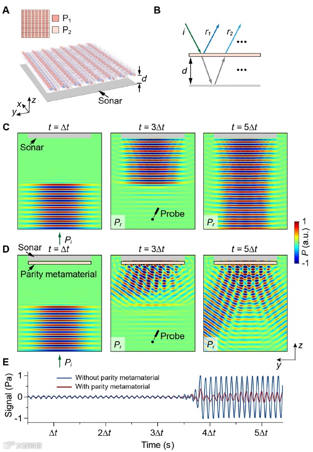 实现的效果:实验与模拟验证,该超材料在0.1-7 kHz超宽频带保持传输波前完整,反射可动态模拟周期性地形、崎岖地形等;时间域伪装能将反射信号强度降至7%以下,兼顾声纳探测与隐蔽需求,适用于先进声纳系统。