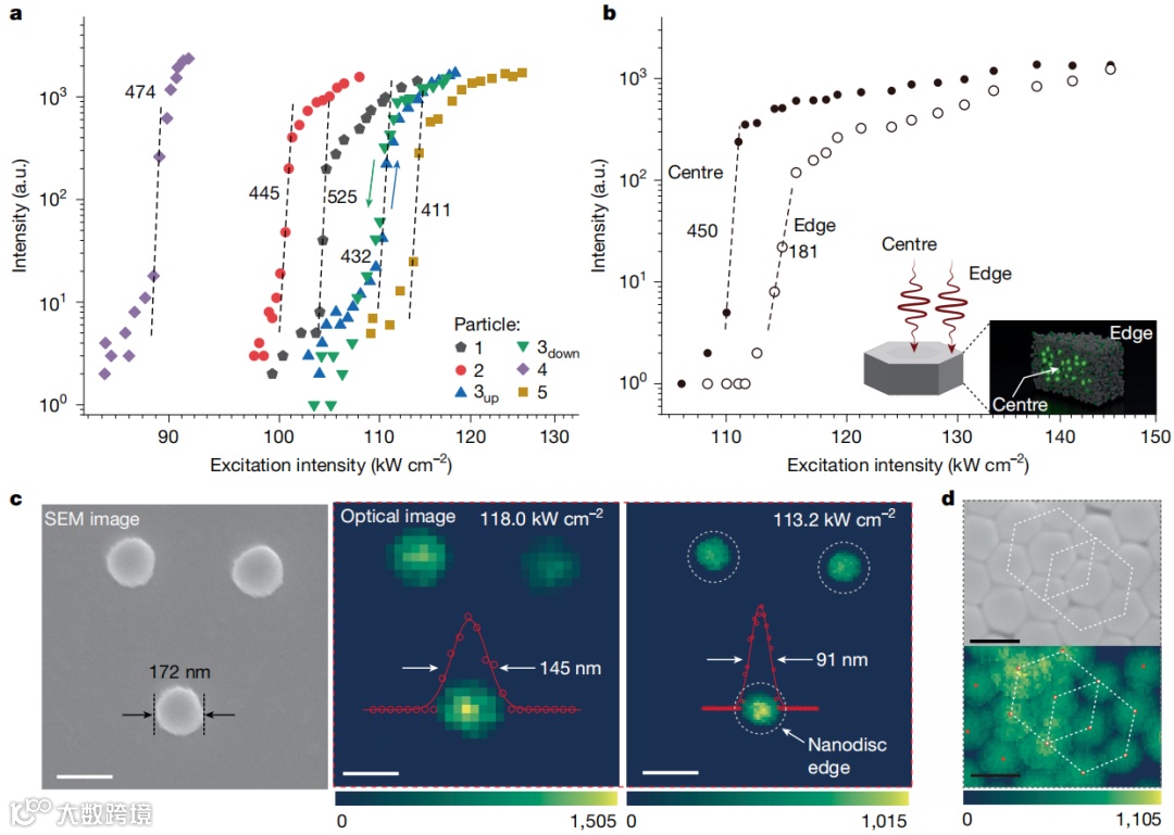 3.通过扩展光子雪崩正反馈网络,研究团队在直径为176 nm的NaLuF4:Tm 纳米盘中首次实现了超过500阶的光学非线性,刷新了室温条件下光子雪崩非线性材料的性能纪录。同时,首次揭示了激光扫描过程中,光子雪崩在单个纳米粒子内部存在区域响应差异:与中心区域相比,边缘区域的非线性阶数显著降低,激发阈值显著升高。基于此,纳米样品展现出“成像尺寸小于物理尺寸”的现象,揭示了光子雪崩非线性发光过程在空间尺度上的响应异质性。