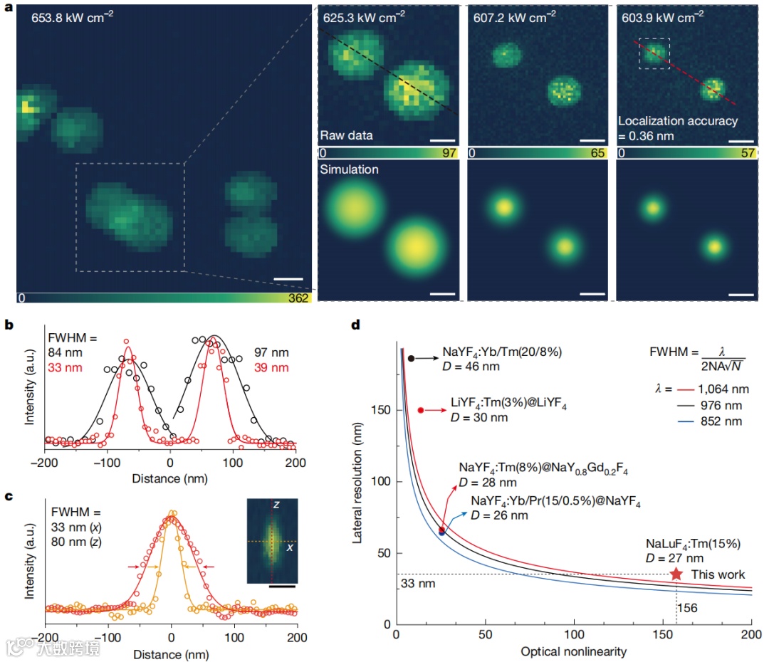 2.以离子半径更小、原子质量更大的Lu3+离子替代Y3+离子,有效调控晶体内空位与离子的排布倾向,引入局部晶体场畸变,有效加速了光子雪崩过程中的关键交叉弛豫过程。该策略使得27-nm纳米颗粒的光学非线性从40提升至156,雪崩响应时间显著缩短至8.5毫秒,较传统核壳结构纳米晶缩短近70倍,展现出优异的快速响应特性。在单束连续波激光扫描成像系统中,该材料实现了横向33 nm(约为波长的1/33)、轴向80 nm(约为波长的1/13)的空间分辨率,成像信噪比大于20,定位精度高达0.36 nm, 展示出在低成本超分辨成像的应用潜力。
