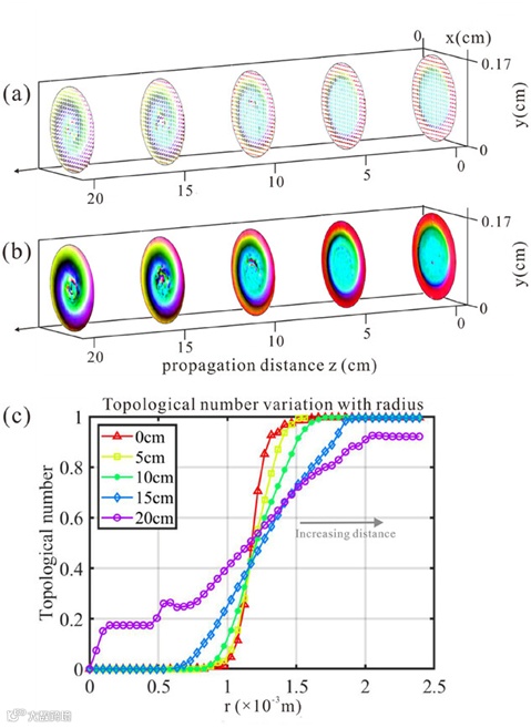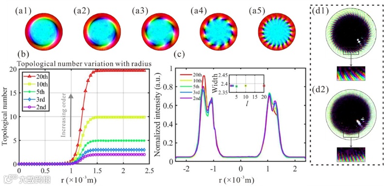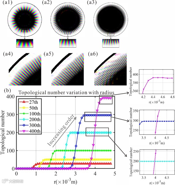 图3给出了超高阶斯格明子的实验结果。图3(a1)到(a6)用HSL色图画出了产生的超高阶斯格明子的偏振分布,分别是27阶、50阶、100阶、200阶、300阶及最高可达400阶的实验结果,可见随着拓扑数的增加,斯格明子的彩色的角向偏振重复周期不断增大,并且大小也发生了改变,越高阶的斯格明子整体上范围越大,这是由于涡旋光束大小随着轨道角动量的增大而增大的特性导致的。图4(b)给出了实验产生的超高阶斯格明子各自的拓扑数随着积分半径的变化,从曲线的阶梯状趋势可以看出,阶数的增大与斯格明子的大小是呈正相关的,右边的局部放大图展示了实验实际上产生的并且经由计算机计算得到的最大拓扑数,与理论预期基本吻合,虽然受限于图片分辨率以及积分方法的精度,我们实际得到的最大拓扑数也高达392.0620,这在任何物理系统中都是一项激动人心的高阶拓扑数记录。