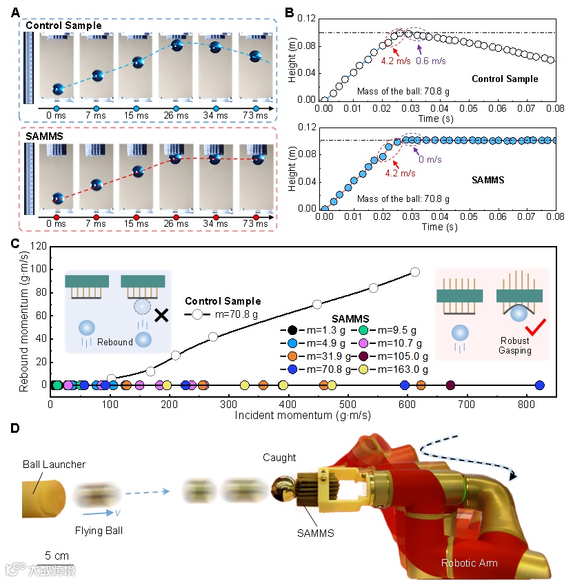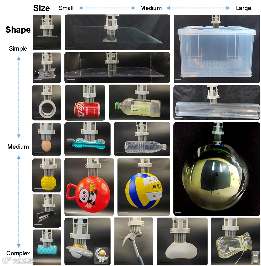 SAMMS的多功能性在系列实验中得到验证,可实现从玻璃、鸡蛋、棒球到直径500 mm空心钢球的稳定抓取(重量覆盖自身质量的44倍,尺寸达480倍)。