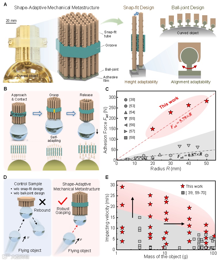在机器人领域,实现对不规则三维物体的稳定可靠抓取,以及对高速动态目标的精准捕获,一直是亟待突破的重要挑战。在诸多抓捕方式中,粘附式抓手具备节能、可持续等优势。然而,传统粘附式抓手在适应复杂非平面表面形貌、应对动态碰撞过程中的能量耗散于缓冲方面,仍存在显著局限,严重制约其在复杂环境下的实用性和通用性。