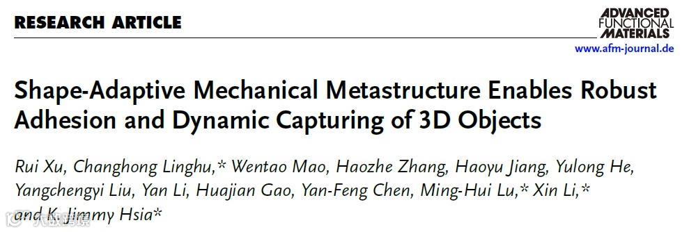 R. Xu, C. Linghu, W. Mao, et al. Shape-Adaptive Mechanical Metastructure Enables Robust Adhesion and Dynamic Capturing of 3D Objects. Adv. Funct. Mater. (2025): e14499.