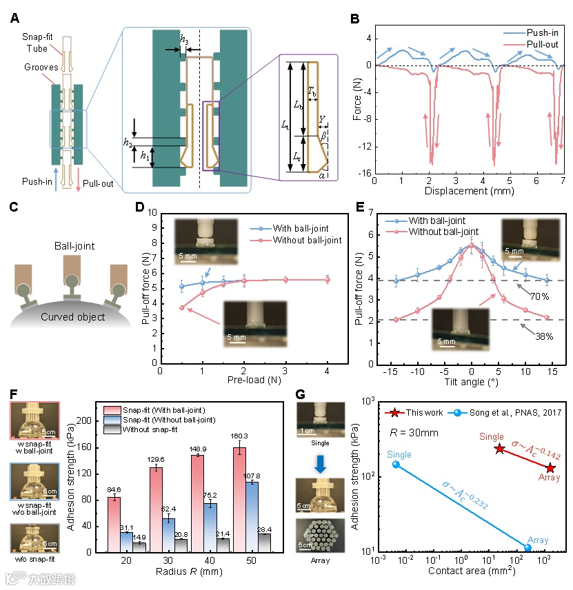 图2. SAMMS的卡扣结构、球窝结构设计以及粘附性能