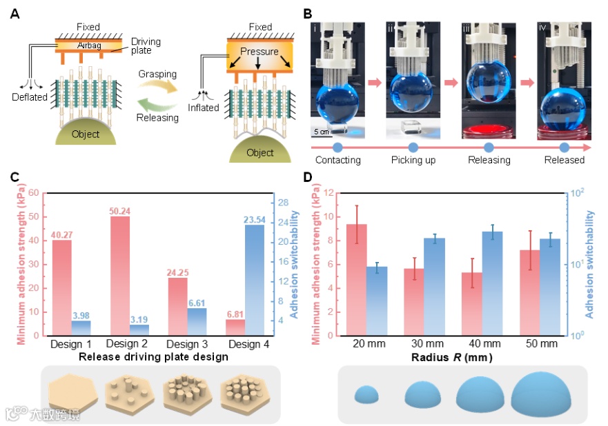 可控释放机制:通过气动驱动的推板结构选择性推出卡扣圆管,实现接触面积的动态调控。在50 mm半径半球表面测试中,其粘附切换比(最大/最小粘附力)达23.54,为精准释放提供了可靠保障。