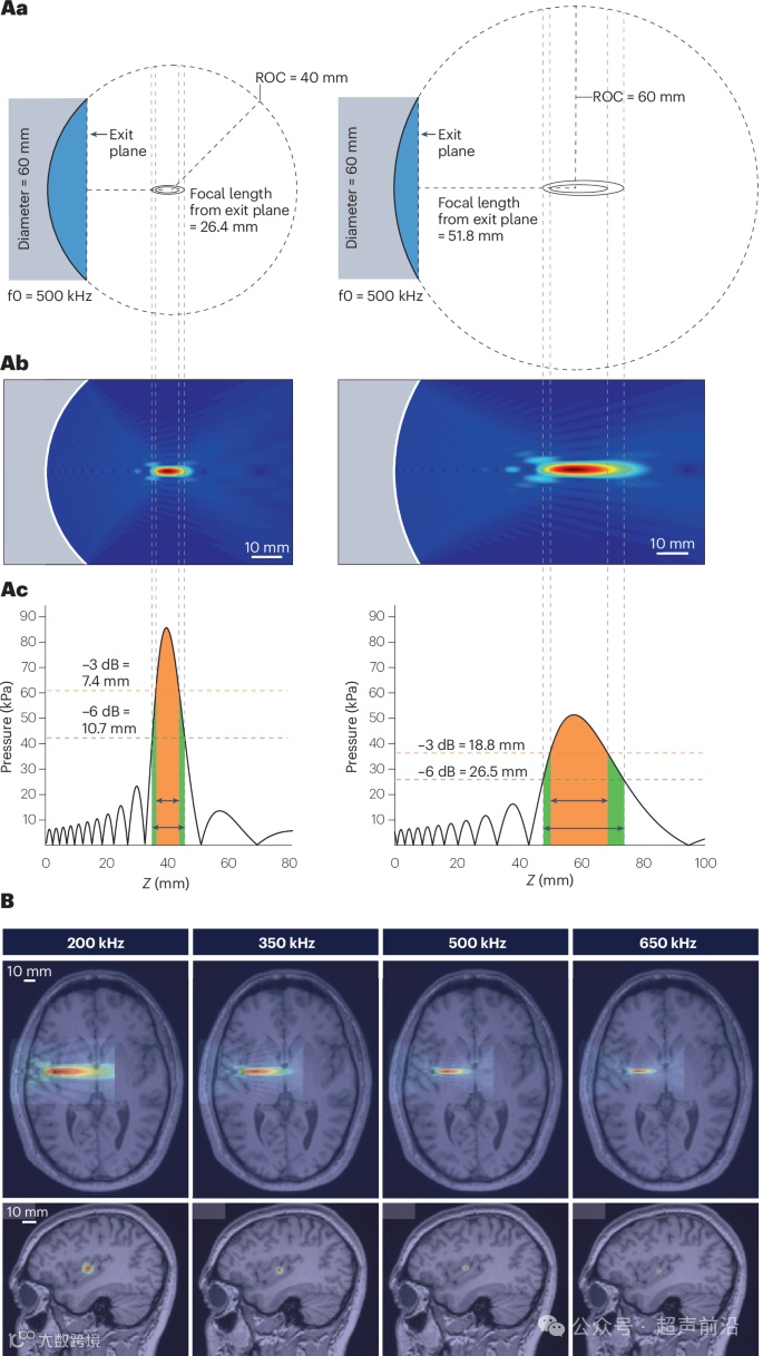 人类LIFU应用通常使用球形聚焦换能器,其聚焦效果取决于多种物理特性,如直径、曲率半径和频率等。不同特性的换能器可产生不同形状和尺寸的焦点,以满足不同深度和大小目标区域的需求。