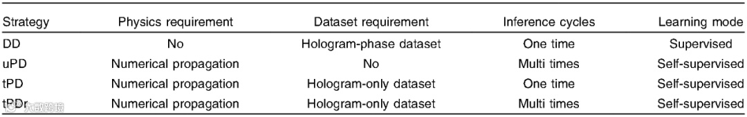 物理驱动(Physics-driven, PD)的深度学习相位恢复方法如图2所示。在自监督模式下,使用数值传播方程作为显式先验(Explicit prior)引导神经网络的收敛。与在相位域计算损失函数的DD不同,PD通过数值传播方程将神经网络输出从相位域转换到全息图域后计算损失函数。PD可以通过三种方式优化神经网络:未训练的PD(untrained PD, uPD)、训练的PD(trained PD, tPD)、带有微调的tPD(tPD with refinement, tPDr)。