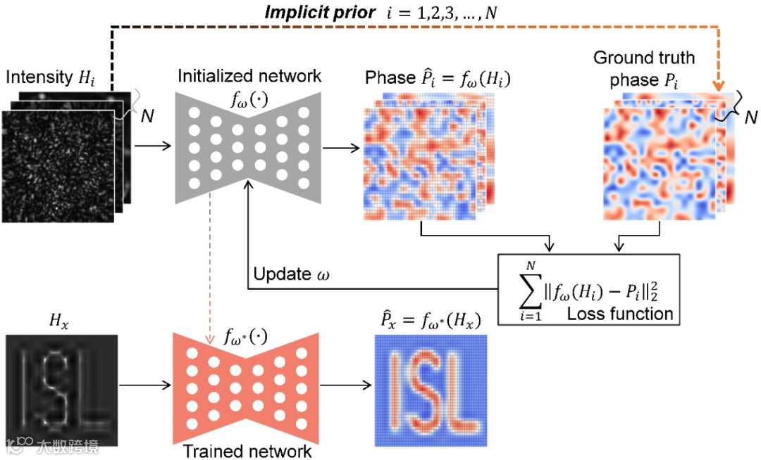 数据驱动(Data-driven, DD)的深度学习相位恢复方法如图1所示。通过实验或模拟获取的训练数据集通常包含数千到数十万的全息图-相位配对数据,其中就包含了从全息图到相位的隐式先验(Implicit prior)。在监督模式下,训练阶段通常持续数小时甚至数天,但只需进行一次。之后,将待测样品的全息图喂入训练好的神经网络后便可快速推断出光波相位。