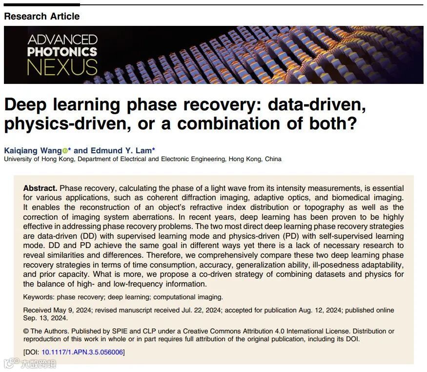 香港大学林彦民教授和西北工业大学王凯强副教授(曾任香港大学博士后研究员)在相同的条件背景下对数据驱动和物理驱动两种策略进行了对比,如时耗、精度、泛化能力、病态适应能力和先验容纳能力。此外,研究人员提出了一种数据和物理联合的驱动策略以平衡高频和低频信息。研究结果以“Deep learning phase recovery: data-driven, physics-driven, or a combination of both?”为题,发表在Advanced Photonics Nexus 2024年第5期,并获选为Editors' Pick。本文同时收录于Advanced Photonics 姐妹刊的联合专题“ AI and Photonics”中,该专题邀请到加州大学圣地亚哥分校Yeshaiahu (Shaya) Fainman教授和中国科学院上海光机所司徒国海研究员担任专题编委,集中发布和分享人工智能与光子学交叉领域的基础研究和突破性应用进展。