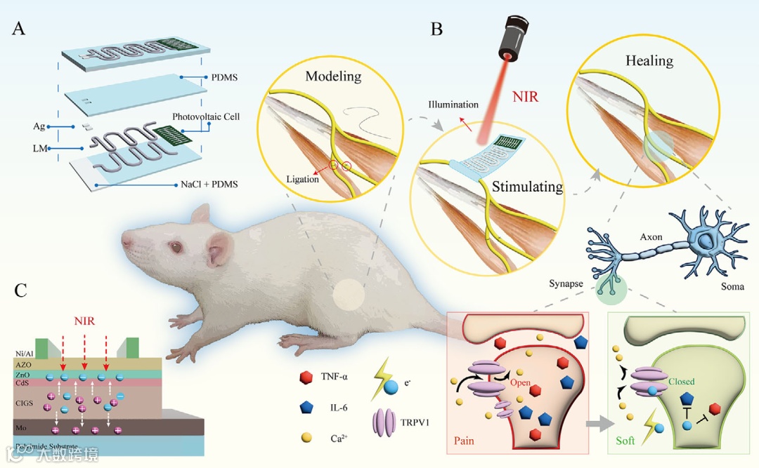慢性神经病理性疼痛是临床重大挑战,常需长期使用阿片类药物,存在成瘾、耐受和副作用等问题,且无法精准靶向痛觉神经。现有的神经电刺激(ES)技术虽有潜力,但存在侵入性强、可能造成医源性神经损伤等局限。因此,探索新的治疗方法具有重要意义。