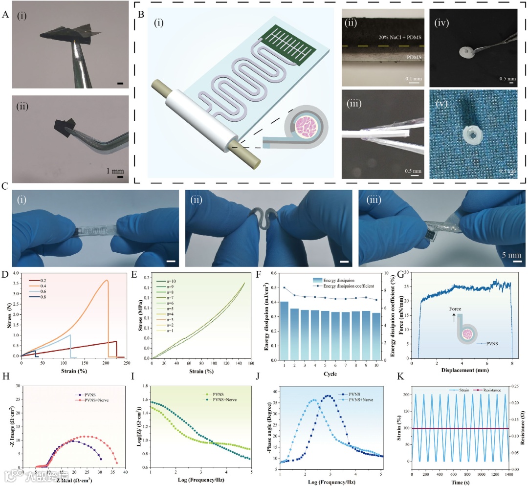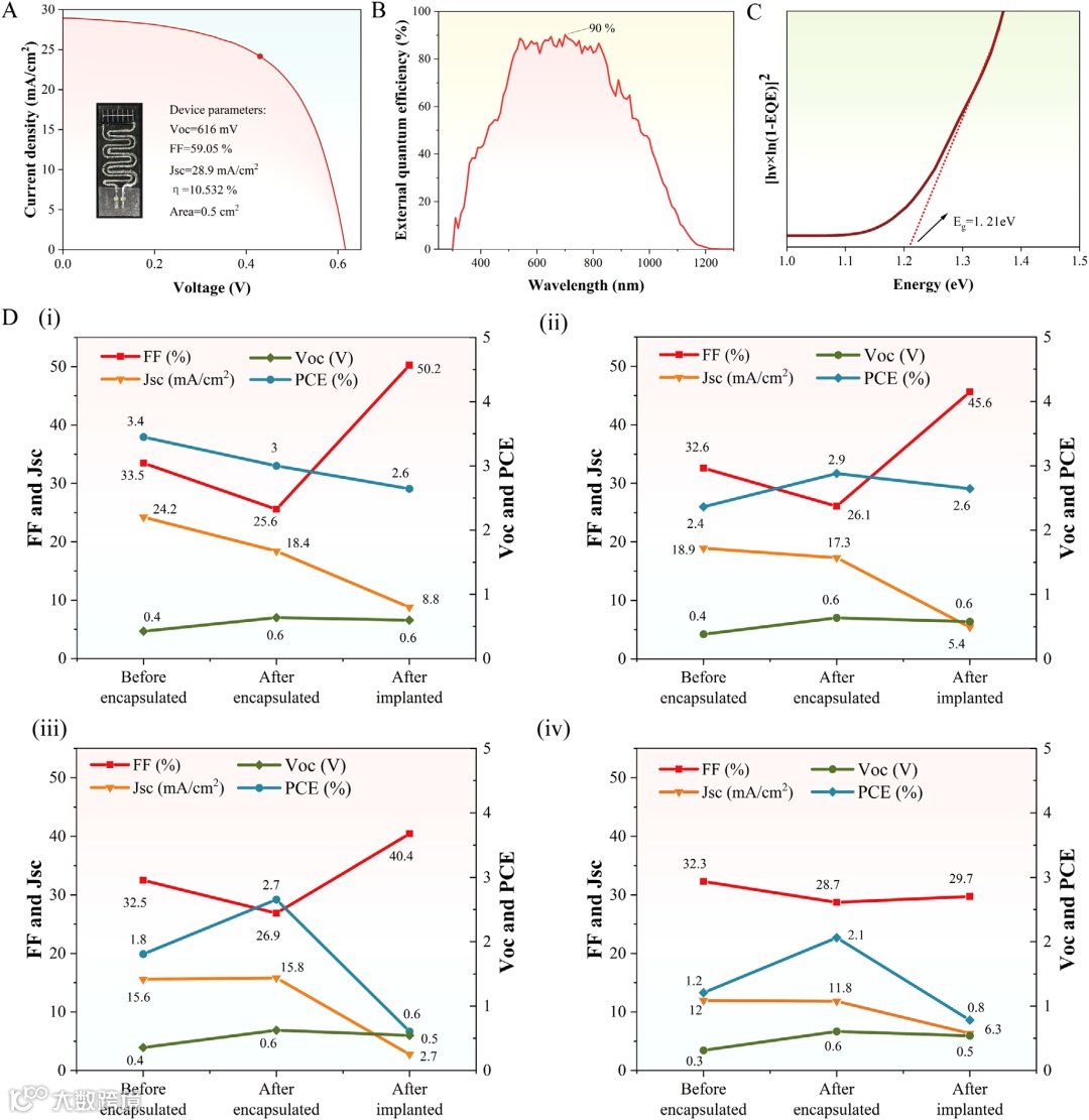 创新的设备设计:开发了一种全植入式、无线且自适应的光伏神经刺激器(PVNS),结合了柔性CIGS薄膜光伏电池和自卷曲袖套电极,实现了近红外光触发的神经电刺激。