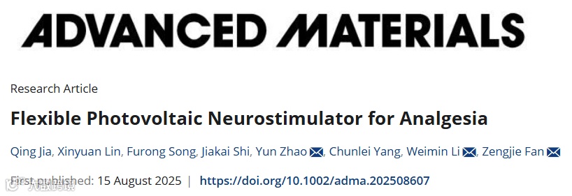 兰州大学口腔医学院范增杰、中国科学院深圳先进技术研究院李伟民、西北师范大学赵雲团队开发了一种新型的全植入式、无线且自适应的光伏神经刺激器(PVNS),用于慢性疼痛管理。该工作以“Flexible Photovoltaic Neurostimulator for Analgesia”为题,发表在《Advanced Materials》期刊上。