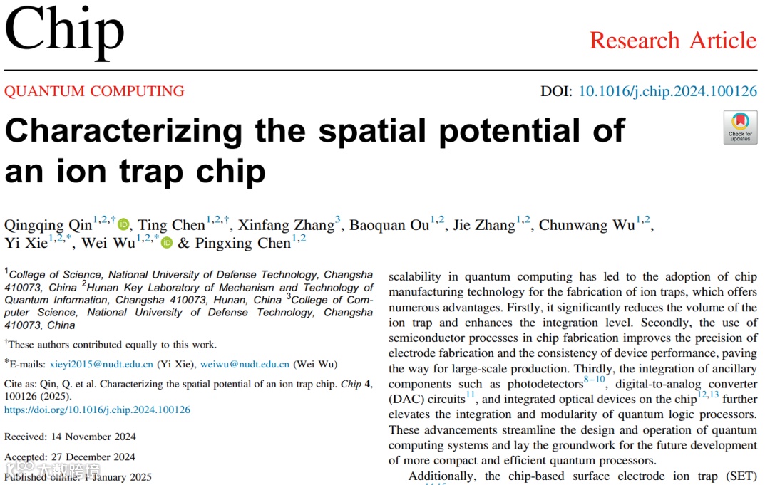 近日,国防科技大学陈平形团队以「Characterizing the spatial potential of an ion trap chip」¹为题在Chip上发表研究论文,提出了一种基于多类型数据优化方法的离子阱芯片空间电势表征技术。共同第一作者为秦青青、陈婷,通讯作者为谢艺、吴伟。本文被遴选为本期Featured in Chip编辑特选文章之一。Chip是全球唯一聚焦芯片类研究的综合性国际期刊,已入选「中国科技期刊卓越行动计划高起点新刊项目」、「中国科技期刊卓越行动计划二期项目-英文梯队期刊」,为科技部鼓励发表「三类高质量论文」期刊之一。
