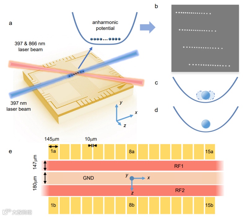 Fig. 1 | Scheme for spatial potential characterization of an ion trap. a, A linear ion chain is trapped above a surface electrode trap (SET) and Doppler-cooled by 397 nm and 866 nm lasers. b, When the control voltages are changed, the ion chain (containing 6–19 ions) moves to a new equilibrium position, and these changes are recorded. c, Vibrational frequencies are measured at different trapping voltages. d, The equilibrium position of a single ion is also recorded simultaneously. e, Schematic diagram of the "five-wire" linear ion trap. The DC electrodes located on the y = 0 plane are labeled from 1a(b) to 15a(b).