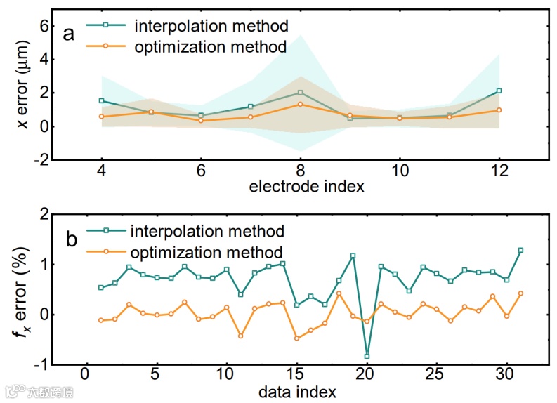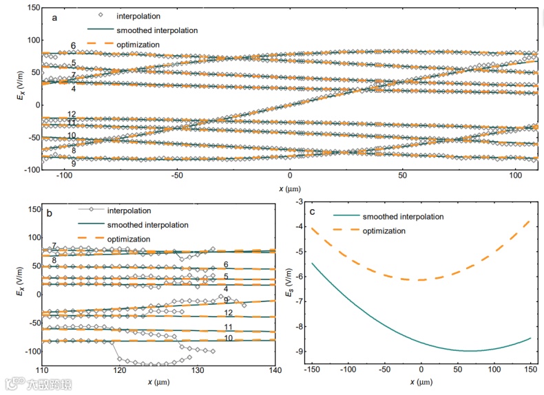 In this study, the electric field distributions of electrodes 4 to 12 were characterized in a surface-electrode ion trap with 15 pairs of electrodes. This method was compared with the interpolation method that relies solely on the position data of the moving ion chain³, with the results shown in Fig. 2. Since the original interpolation method yielded discretized and highly fluctuating electric field strengths, a model with free parameters was used to fit the central region of the electric field data obtained by interpolation, where the fluctuations were smaller. The smoothed interpolation model generally agrees with the results obtained from the optimization method for the electrode potentials. However, there are certain differences between the two methods in the characterization of stray fields.