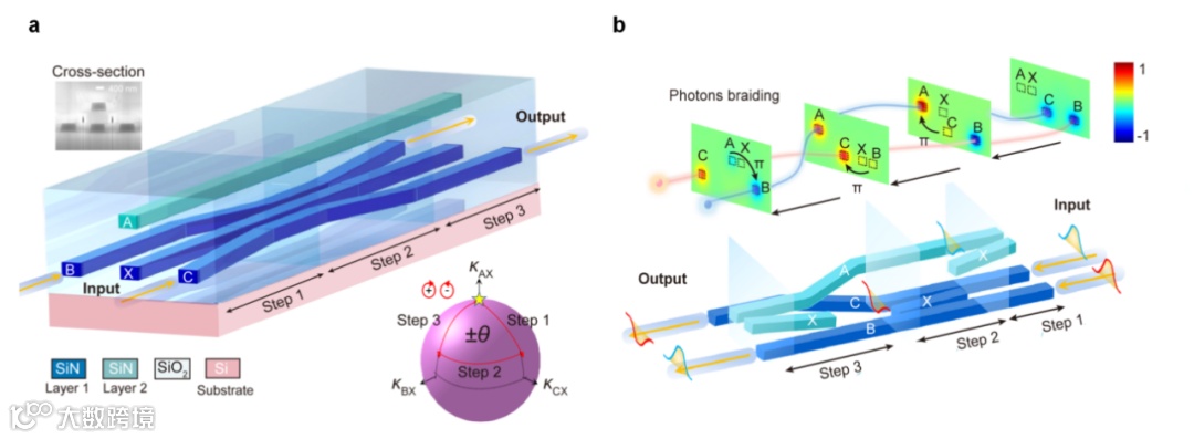 图1 基于多层氮化硅平台的SO(2)几何相位器件:(a)一般SO(2)矩阵器件;(b) 模拟任意子交换2模编织器件