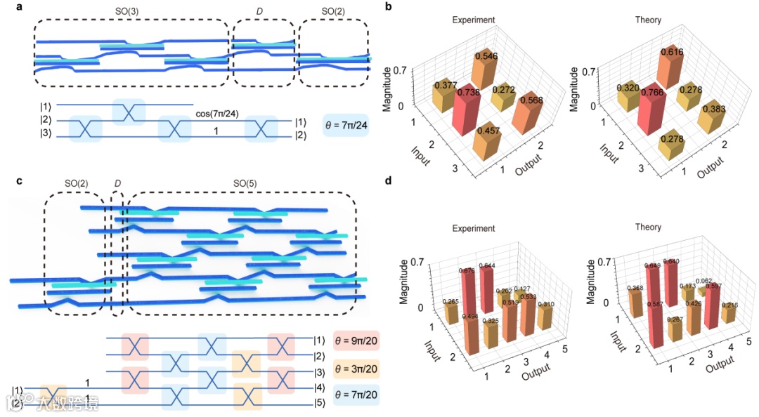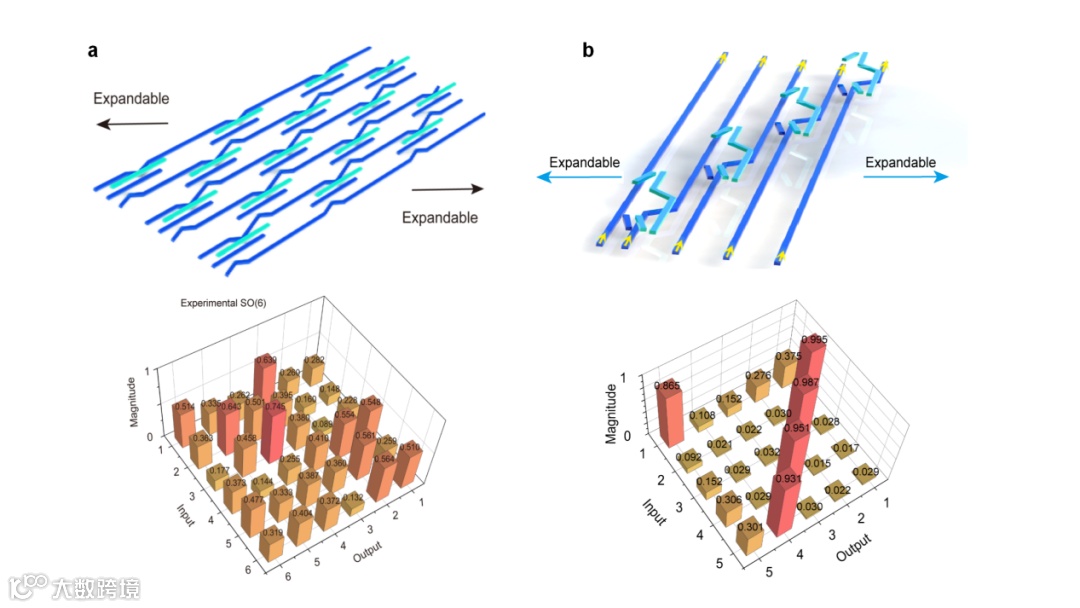 更进一步,研究团队基于奇异值分解模型,在SO(m)架构基础上拓展实现了任意M×N矩阵的光计算功能(图4)。该广义矩阵变换器同样继承了宽带特性,可以承载矩阵-矢量乘法等计算任务。这种概念验证展示了非阿贝尔几何相位在矩阵-矢量乘法光计算中应对复杂任务的潜力。