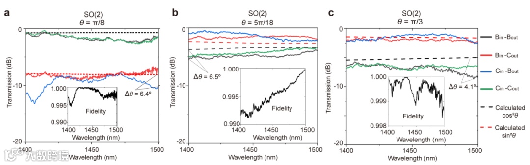 在本研究中,研究团队基于双层氮化硅波导集成平台首次构建了高维非阿贝尔几何相位。如图1所示,该四波导结构支持两个简并超模,通过精确调控波导间的间距,实现对耦合系数的连续调节,从而驱动系统在参数空间中进行绝热演化。当系统沿闭合路径完成一次循环演化后,便生成一个基本的SO(2)几何相位单元,即输入—输出满足一个二阶酉矩阵(属于SO(2)群)的线性关系。通过改变演化路径的参数,可以实现一般SO(2)矩阵变换器件(图1a),以及模拟任意子交换的2模编织器件(图1b)。图2的传输谱表明,所实现的光学变换在超过100 nm的宽波段范围内保持高保真度,展现出优异的宽带响应特性。这一优势源于几何相位的本质属性—由参数空间中的演化路径决定,因而对波长的变化具有天然鲁棒性。