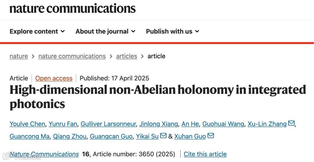 Youlve Chen, Yunru Fan, Larsonneur Gulliver, Jinlong Xiang, An He, Guohuai Wang, Xu-Lin Zhang*, Guancong Ma, Qiang Zhou, Guangcan Guo, Yikai Su*, and Xuhan Guo*, '' High-dimensional non-Abelian holonomy in integrated photonics,'' Nat Commun 16, 3650 (2025).