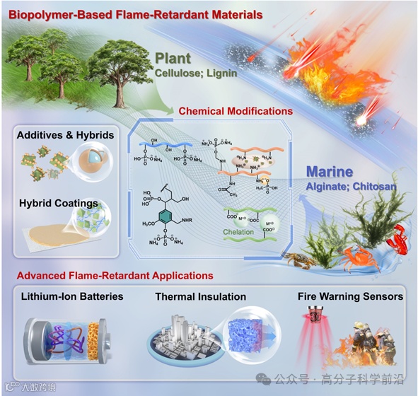 大学徐英俊教授等聚焦纤维素、几丁质/壳聚糖、海藻酸盐和木质素等非食源生物大分子,系统梳理了生物大分子的热解过程、影响因素以及生物阻燃性体系的改性手段、构建途径(主要是磷酰化),回顾了