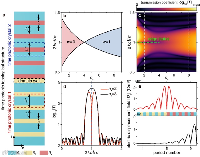 具有手性对称的时间光子晶体存在以缠绕数表征的整数拓扑不变量,不同的单元结构对应不同的拓扑相位(见图2)。作者通过拼接具有非平庸和平庸拓扑相位的两个具有手性对称性的时间光子晶体来构建时间光子拓扑系统(见图3a),发现在手性点处出现时间拓扑边界态,这种边界态的出现导致位于动量带隙内原本放大的透射率急剧下降。(见图3d)。