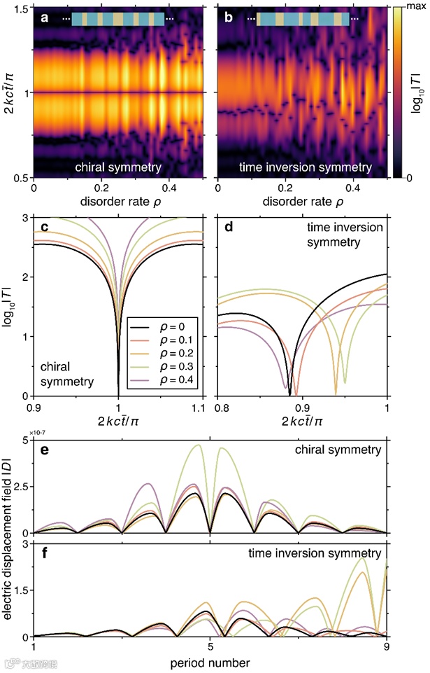 受手性对称性的保护,具有手性对称性的时间光子晶体形成的时间拓扑边界态呈现很强的鲁棒性。本文比较了无序对具有手性对称性的时间光子晶体与具有时间反转对称性的时间光子晶体中的拓扑时间边界态的影响。作者在折射率上引入随机无序:对于手性结构,通过调整各层持续时间使折射率与时间比值不变;对于时间反转结构,维持每个原胞的折射率满足时间反转对称n(t) = n(-t)。结果表明,手性对称保护的时间边界态的特征值对无序具有很强的鲁棒性,而受时间反转保护的时间边界态的特征值随着无序增强剧烈振荡。此外,本文还意外发现:随着无序强度的增大,手性对称性的边界态的局域性甚至变得更强(见图4c)。这种差异表明,往往被认为不利因素的无序扰动在手性对称性时间光子晶体中反而具有增强时间边界态局域性的优势。