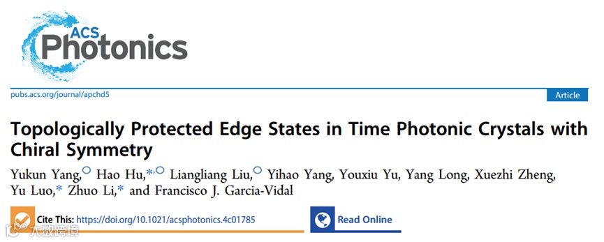 近日,南京航空航天大学电子信息工程学院的罗宇教授与李茁教授领导的多功能光电超材料团队及其合作者们研究了具有手性对称性的时间光子晶体,并首次发现了受手性对称性保护的拓扑时间边界态。相关成果以“Topologically Protected Edge States in Time Photonic Crystals with Chiral Symmetry”为题发表于期刊《ACS Photonics》上。南京航空航天大学电子信息工程学院杨玉昆博士为论文第一作者,南京航空航天大学电子信息工程学院胡昊教授和刘亮亮教授为共同第一作者; 南京航空航天大学电子信息工程学院胡昊教授、罗宇教授和李茁教授为通讯作者。其他合作单位还包括西班牙马德里自治大学、比利时鲁汶大学、新加坡南洋理工大学和浙江大学。