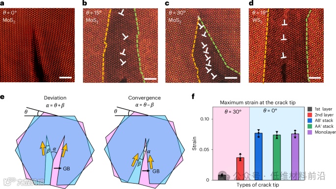 图2 | 扭角TMDs中的晶界形成机制与裂纹尖端钝化效应。