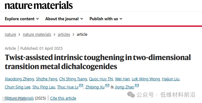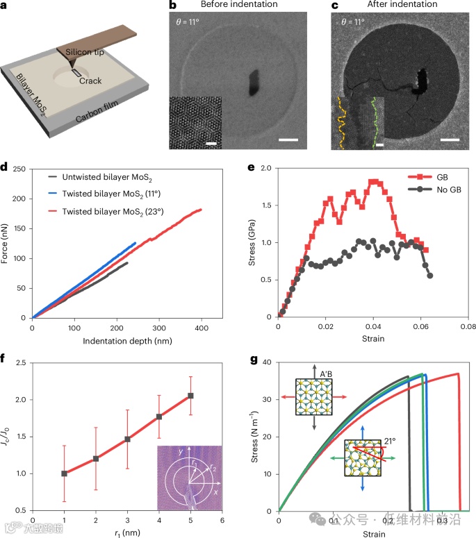 鉴于此,香港理工大学赵炯教授、清华大学徐志平教授与香港城市大学李淑惠教授联合团队在Nature Materials期刊上发表了题为「Twist-assisted intrinsic toughening in two-dimensional transition metal dichalcogenides」的最新论文。该团队通过对双层过渡金属硫族化合物(如二硫化钼和二硫化钨)的研究,发现扭转双层结构能够显著提高材料的断裂韧性,而不会牺牲其强度。该团队通过原位球差校正透射电子显微镜、纳米压痕实验以及理论分析,揭示了扭转角度对材料断裂韧性的影响。