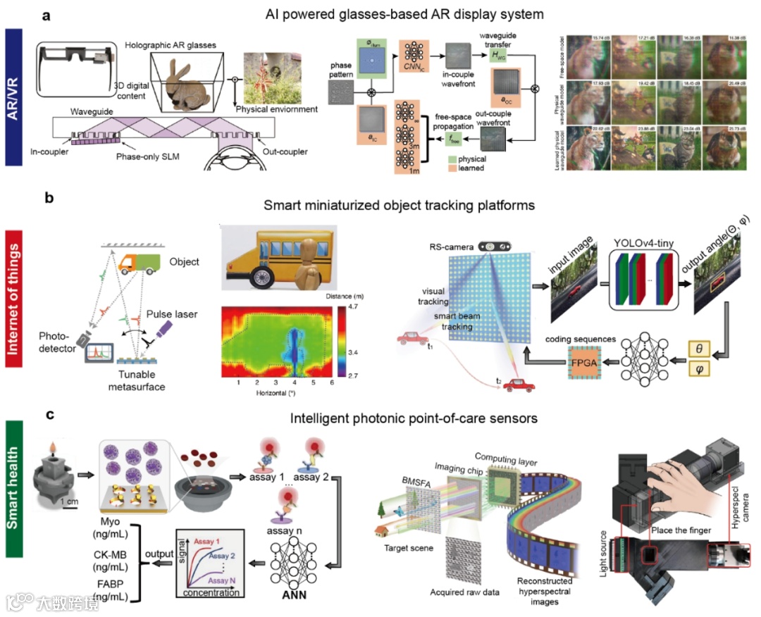 我们预计在不久的未来,人工智能技术与光子学的深度融合将催生颠覆性的技术与基础设施,重新塑造我们的日常生活。例如,在“元宇宙”的宏伟愿景中,智能光子学能够提供高吞吐量、无缝衔接的信息交互界面,在极为紧凑的系统中高效传输数字世界与现实世界之间的视觉内容。此外,随着高速网络的普及,物联网设备的互联互通将从这一融合中受益,进一步推动智能互联时代的发展。同时,纳米光子学与人工智能的协同进步,也将在医疗领域带来深远影响,特别是在早期智能诊断方面,有望实现更精准、高效的健康监测和疾病预测,为未来医疗系统奠定坚实基础。从元宇宙,物联网到智慧医疗,智能光子学系统将为这些前沿领域提供更加强有力的技术支撑。