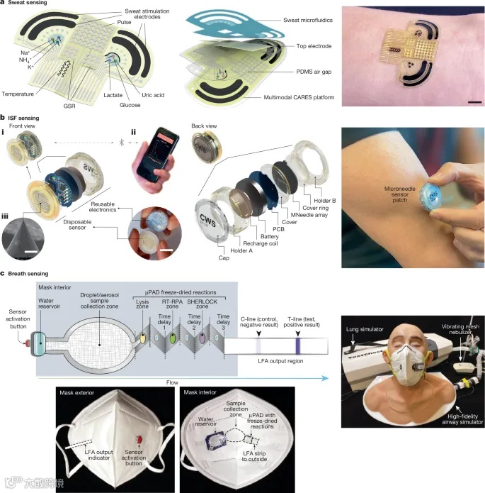 图1: 体液分析的可穿戴传感平台。a. 汗液感测的电子皮肤,能够进行多模态感测,包括生化汗液分析(例如Na+、NH4+、K+、乳酸、葡萄糖和尿酸)以及生物物理测量(例如温度、脉搏和皮肤电反应(GSR))。比例尺,1厘米。b. 用于组织间液(ISF)感测的微针基础设备,带有一次性传感器和可重复使用的电子设备,允许监测葡萄糖、乳酸和酒精。用户智能手机上显示的感测结果。比例尺,1.5厘米。c. 用于呼吸感测的CRISPR基础侧流层析(LFA)平台以及纸基样本制备单元,嵌入到口罩中,实现SARS-CoV-2基因的直接检测。