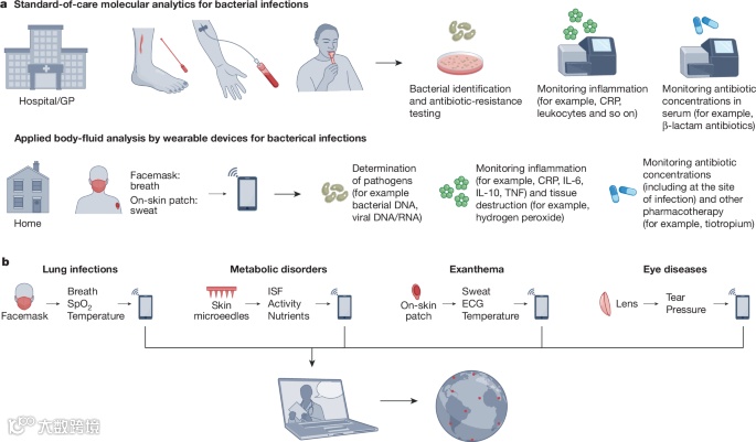 图4: 在临床医学中,可穿戴设备的应用体液分析。a. 一个示例应用是监测抗生素治疗以管理细菌感染。到目前为止,评估细菌感染以识别潜在的病原体、评估炎症状态和监测药物浓度主要在专业实验室中通过耗时且昂贵的程序来完成。将这些测试集成到可连接的、基于智能手机的分析中,可以实现在医院和门诊设置中无缝且以患者为中心的健康监测。b. 另一个示例应用是促进在资源匮乏地区获得复杂诊断的机会。通过选择相应的生物传感器和体液,可穿戴设备体液分析可以用于识别和监测下呼吸道感染、导致皮疹的疾病、眼部疾病以及代谢紊乱,无论是在海上还是陆地上。