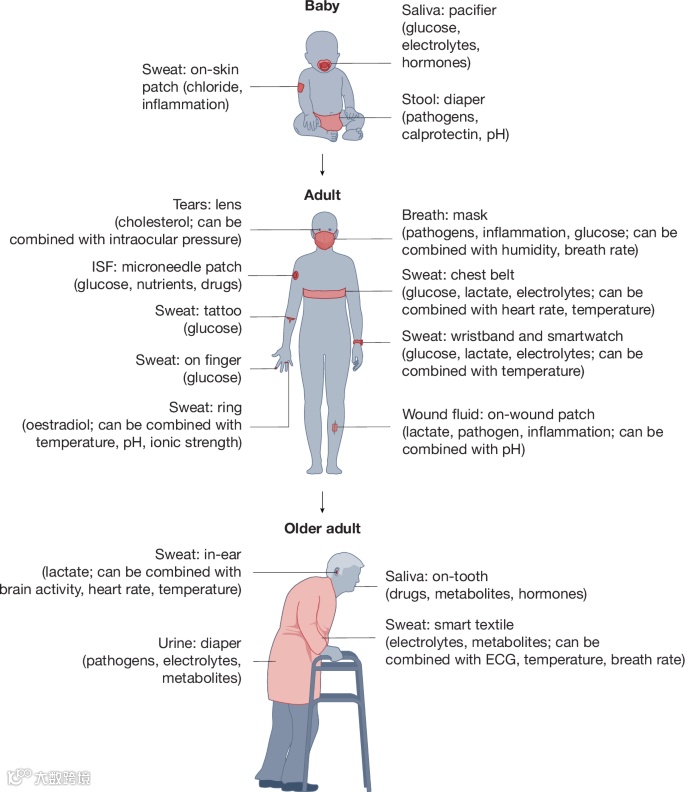图2:展示了不同人生阶段针对各种体液的可穿戴感测设备。每个生命周期都伴随着不同的挑战和需求。例如,婴幼儿可能需要含在口中的传感器(如血糖、电解质、激素),成年人可能使用戒指(如雌激素),老年人可能使用助听器(如胆固醇;可以与眼内压测量结合)。